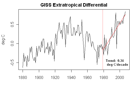 Also here’s the same plot from GISS annual data (24-90N minus 24-90S). Seems to me like I’ve seen a plot like this somewhere before and it caused apoplexy in Team-world.