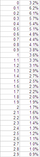 Following is a table of absolute values and their corresponding probabilities, through a delta value of 2.9 degrees:
