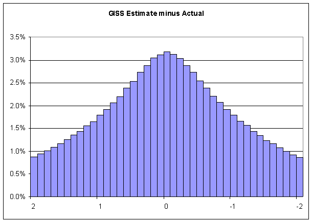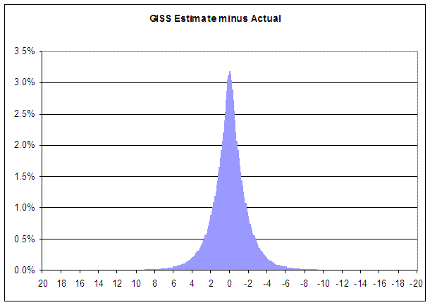Referring to the table, the probability GISS will create an estimate within 0.4C of the actual value is 26.7%. A value between 0.5 C and 0.9 C has a 22.2% probability of occuring. Similarly, 1.0 C to 1.9 C is 26.5%, and 2.0 C to 2.9 C is 12.7%. There is about a 12% probability that the GISS estimate will be off by 3.0 C or more.