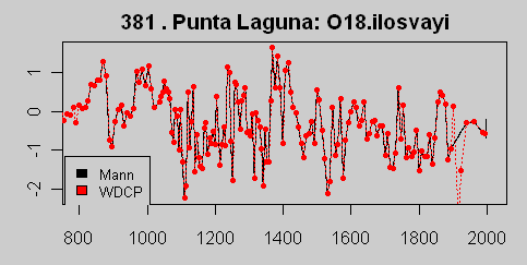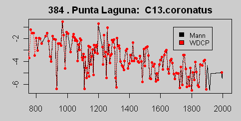 I’m spending a little extra time examining the “new” Mann 2008 MWP non-dendro “proxies”. There are 4 series from varved lake sediments in Punta Laguna, Mexico: two dO18 and two C13 series, each for a different gastropod species.