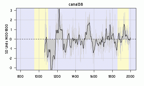 Here are 5 graphics which show all the Mann 2008 proxies in a consistent format, highlighting two periods 950-1100 and 1850-1980. My software only permits 300 gif images per gif-movie, so 5 parts. The graphics show nicely how few series actually have low-freq variability and how few series are really contributing to any HS-ness. The series are shown in the alphabetical order of Mann’s data set. The Luterbacher series include instrumental information and their impact needs to be studied,