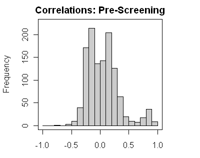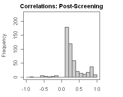 I’ve made histograms of reported proxy correlations for 1850-1995, as reported in r1209.xls (which contains results for all proxies, unlike SI SD1.xls which withholds results below a benchmark.) The breaks are in 0.1 intervals. On the left is the histogram before screening; on the right, a histogram of the 484 proxies after screening.