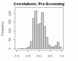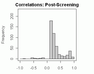 Are you saying that the significance of the observed correlations are lower than they appear to be in the pre-screen histograms? It’s well known in economic time series analysis that two highly correlated variables that are also AR(1) autocorrelated can produce a high r2 when regressing one variable on the other but, when correcting for the autocorrelation, can result in extremely low r2. Is this somewhat the same idea? Thanks.
