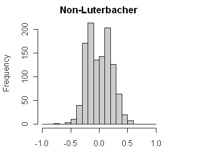 A little inspection showed that the right-hand bulge of very high correlations arose entirely from the Luterbacher gridded series, which, as I understand it (and I haven’t reviewed the Luterbacher data), contains instrumental information in the calibration period and is not a “proxy” in the sense of tree rings or ice cores. So when Mann says that 484 series passing a benchmark is evidence of “significance”, this inflates the perceived merit of tree ring and ice core data since the 71 Luterbacher series make a non-negligible contribution. Removing the Luterbacher series, one gets the more symmetric distribution shown below: