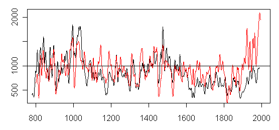 Quite obviously this data set doesn’t have a HS and doesn’t look anything like the Briffa version of Yamal. Where did it come from? This data version is the Yamal version from the original authors (available at WDCP here ). This version matches the graphic in Hantemirov 2002. (In passing, I’ve observed previously that Juckes et al and other Team articles have cited Hantemirov, when they actually used a Briffa version that is not located at WDCP.)