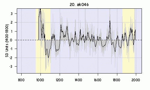 In regards to the MWP-modern differential, Mann et al 2008 is once again not “independent” of the other studies – the entire suite of Graybill strip bark bristlecones rear up once again. Very few of the “new” proxies covering the MWP contain a relevant HS shape and there are fatal problems with the ones that do (e.g. the Korttajarvi sediments) making one question why these sediments are used in a supposedly serious study.