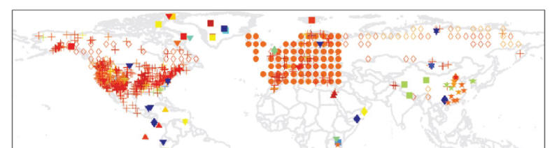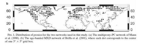 Figure 3. Location map from Rutherford, Mann et al 2005. Original caption: FIG. 1. Distribution of proxies for the two networks used in this study. …(b) The age-banded MXD network of Briffa et al. (2001), where each dot corresponds to the center of one 5° x 5° grid box.