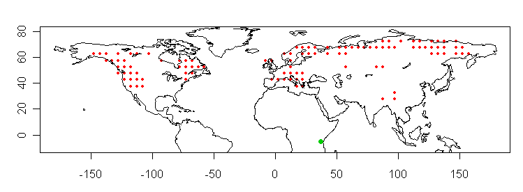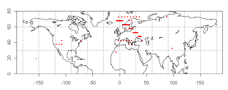 The Mann et al 2008 SI (SD1.xls) lists 105 Osborn MXD series (rows 910-1014 on the spreadsheet) together with latitudes and longitudes. The SI contains ID references such as “schweingruber_mxdabd_grid91”; unfortunately, although I’m as familiar as anyone with proxy IDs, these IDs do not correspond to any data version that I’ve examined. The SI contains latitudes and longitudes and I used these for calculating grid cell correlations. Because of the inconsistency, I went back and plotted these gridcell locations (as shown below).