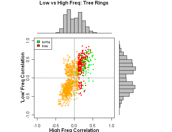The next graphic shows a further remarkable bimodal aspect to Mann’s correlation coefficients – this time, we’re dipping our toes in the murky waters of “low frequency” correlations. The x-marginal distribution is the rtable correlation (“high frequency”) calculated in a usual method (given Mannian RegEMed proxies and temperatures); the y-marginal distribution are the rtable “low frequency” correlations, calculated after smoothing somehow. (See also Matt Briggs’ recent thoughts on this.) I’ve color coded this to show the truncated Briffa correlations in green and the ring width correlations in red and orange – red showing ones that in the Passing 484, orange are Failing. Some points we’ve already noted e.g. the very high reported correlations of the truncated Briffa data. We also previously observed the bimodality of the high-frequency rtable) correlations which I am currently attributing primarily to the pick two effect.