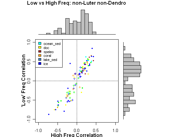 The new point here is that the bifurcation of the low-frequency correlations is noticeably more pronounced than the bifurcation of the high-frequency distributions. I presume that this is related somehow to the Slutsky-Yule effect (a well-known effect in economics time series, where repeated averaging makes series increasingly sinusoidal), but I’m still experimenting. For now, I merely observe that these bifurcated distributions are definitely not the sort of thing that you want to see in sound statistical practice and that there is an eerie deja vu developing, since we’ve already seen weird bifurcated distributions in connection with MBH that even Jolliffe hasn’t grappled with.