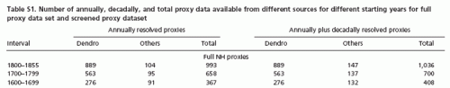 We made use of a multiple proxy (‘‘multiproxy’) database consisting of a diverse (1,209) set of annually (1,158) and decadally (51) resolved proxy series … Reconstructions were performed based on both the ‘‘full’ proxy data network and on a ‘‘screened’ network (Table S1)