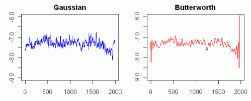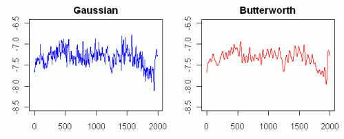 Mark and Carrick, here’s a prominent series (Dasuopu) with a very strong trend. Left a simple gaussian filter, right a Butterworth filter (centered before filtering.) In this case, I applied Mannian fit choices as well.) We see the zero-seeking behaviour at the end of the series resulting in an artifact. This illustrates a case working against his desired result (and in this case is an unreasonable result as well.) My size-up is that practitioners should heed the comments in the manuals that this smooth is designed for frequency and not for time series applications.