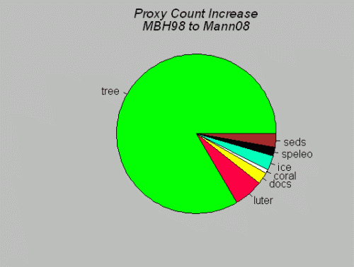 Of the total increase (about 794, depending a little on how the MBH population is determined), as shown in the pie chart below, about 83% are tree ring proxies. The next largest increase comes from the Luterbacher series, replacing the long Jones-Bradley instrumental series – not really proxy series at all. The additions to ice core, coral, speleo and sediment series are all relevant and I’ll review them separately. Today I want to look at where the additions to the tree ring population came from.