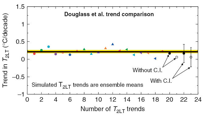 All three surface – 2LT trend differences are statistically significant (21), despite the large, overlapping 95% confidence intervals estimated for the individual IPCC and MSUd 2LT trends (Table 1) (22).