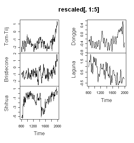 We had just finished smoothing the proxies. This had its own set of complications as Mann used a butterworth filter on uncentered data. This led to peculiar end point problems requiring long end point padding to control the effect of the butterworth filter. Emulating this in R was complicated by the odd problem that R filtfilt operated differently than Matlab filtfilt. Roman M identified and resolved this by writing a pretty function filtfiltx, which emulated Matlab filtfilt, enabling an emulation of Mann’s smoothing function in R.