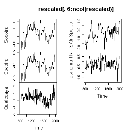 Most of the other series are speleothems, a class of proxy relatively undiscussed at CA. Shihua Cave was used in Moberg; the South African speleothem was used in Loehle, with this use being criticized by Gavin Schmidt. (Loehle used the grey-scale series, Mann used C13 and O18 – some of Schmidt’s disputes with Loehle would seem to apply to Mann as well.) Dongge Cave and Socotra Island are both speleothems as well. I plan to do specific posts on these proxies.