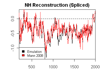 Though Mann has provided a commendable amount of information on the reconstruction, I was unable so far to locate anything other than spliced versions of output (as with MBH98). Below is a comparison of my emulation (spliced) to the spliced NH reconstruction (CRU target). It isn’t quite the same – even when you’re spotted the data and code, it’s never easy repeating a Mann calculation, but it’s pretty close – certainly sufficiently close to feel justified in doing sensitivity analyses, like the impact of using Tiljander data the right way up or Ababneh bristlecones, which I’ll do another day.