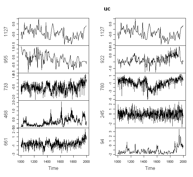 This step is done in the gridboxcps.m program after the comment % calibrate proxies against instrument data. The calibration is a usual Team method: re-scale and re-center the proxy to the mean and standard deviation of the “target” instrumental data. As the program is written, this requires that target instrumental data exist for the gridbox (or gridboxes) to which the proxy is attached. What happens if there is no target instrumental data in the required box? As written, the program omits the affected proxy. In the AD800 network, two series are affected: Agassiz melt and Central Greenland GISP. As far as I can tell, they do not enter into subsequent CPS calculations. So at the end of these two operations, Mannian CPS has double-counted Socotra Island and removed Agassiz and Central Greenland, leaving us with 11 gridcells. [see below as this doesn’t seem to be right for the AD1000 network examined by UC. UC’s compilation below doesn’t contain Tornetrask and Tiljander, but does contain GISP and Agassiz – I’ll check with him on this, as this seems odd.]