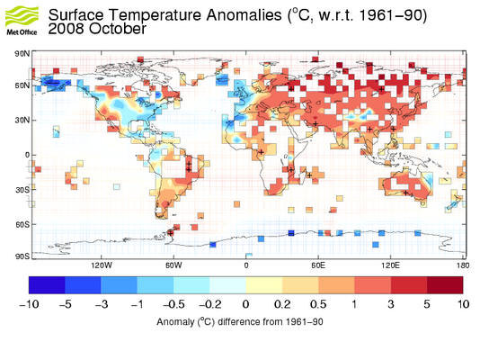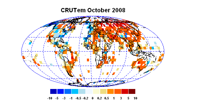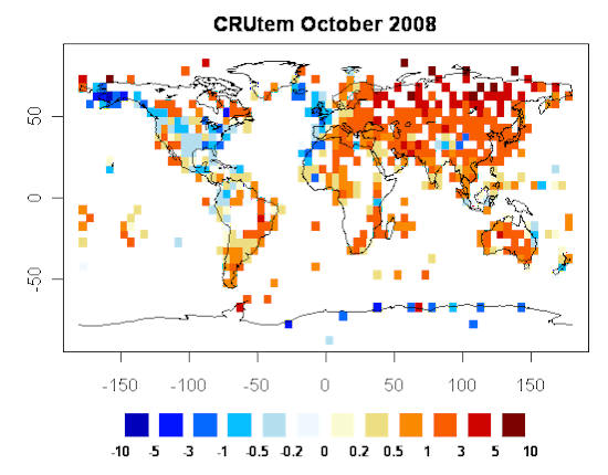 First here is October CRUTEM, followed by my emulation from the data archived at http://hadobs.metoffice.com/crutem3/data/CRUTEM3.nc as of today. I spent a while trying to match the color coding and am close enough for practical purposes. The archived data appears to contain some stations not in the webpage graphic e.g. in Canada.