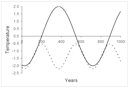 Figure 2. Reconstructed temperature (arbitrary scale) (dotted line) vs. actual (solid line) using a linear approximation to the quadratic from Figure 1. Temperatures larger than the threshold become inverted. Time scale can either be forward, showing divergence, or back in time showing failure to detect past warm periods (from Loehle, 2008).