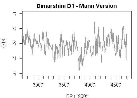 But the Dimarshim D1 (as plotted in Fleitmann Figure 7 #13) matches Mann’s Socotra dO18 series, where it has been interpolated to annual data. As a temperature proxy, Mann uses the Socotra dO18 series with positive dO18 up, while Fleitmann 2007, using the series as a monsoon proxy, uses it with negative dO18 up – the same orientation as Dongge, Wanxiang and Heshang as monsoon proxies. (As a note to a CA reader, Fleitmann accordingly does not rationalize the basis for Mann using Socotra/Dimarshim D1 oriented oppositely to Dongge; that issue remains outstanding.)