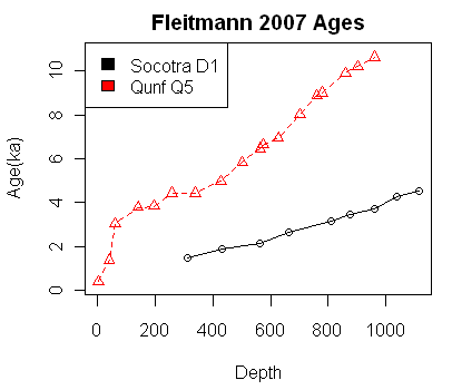 One obvious impression from this picture is first that the Qunf Q5 speleothem has suffered a substantial hiatus. I plotted up a graph doing age-depth comparisons for the two speleothems, which have quite different patterns. So the comparison between the two speleothems is far from ideal on the above basis and it seems to me that one would like to compare two speleothems with more comparable growth histories before investing too much energy in elaborate conclusions. However, that’s not the main point here.