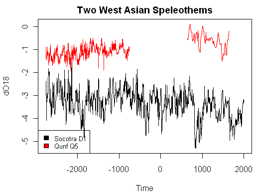Today, I’m going to discuss a couple of points arising out of Fleitmann et al 2007, a discussion of speleothems in western Asia. Most notably, I’m going to discuss a “statistical” calculation made in this article, where the authors relied on a “visual” interpretation of noisy time series, which readily permit an alternative interpretation. (The reference to Fleitmann et al 2007 arises out of prior discussion of speleothem dO18 series; the comment today is not a direct response to that discussion, it’s a standalone comment prompted by my reading of the article.)