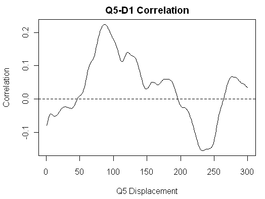 “Visually”, it looked to me like the Qunf Q5 series might fit with the D1 series a bit better if its dates were brought a little closer to the present. So I displaced the Q5 series one year by one year towards the present and for each displacement calculated a correlation, yielding the graphic below (this sort of method is used in dendro dating as a check.) By bringing the Q5 series about 85 years closer to the present, instead of a negative correlation of -.078, we get a positive correlation exceeding 0.2 (probably with improved autocorrelation properties in the residuals though I didn’t check this.) An 85 year displacement is well within the error bounds of the speleo dating method.