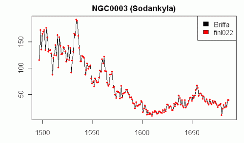 Now let’s look up this code, NGC, in the Briffa information file. This yields one series NGC0003X ending in 1687 (just before 1689 construction).