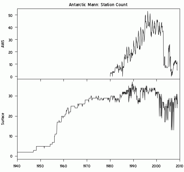 Here’s an interesting little plot from the collation of surface and AWS data. For some reason, there seems to be a sharp decline in AWS counts at the start of 2003 – from 35 at the end of 2002 to 9 at the start of 2003. It seems implausible that this is real though I am not familiar with the data and perhaps it is. Maybe it’s an Antarctic version of GHCN not collecting non-MCDW station data after 1990?