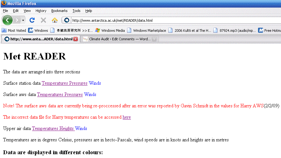 The BAS AWS page at http://www.antarctica.ac.uk/met/READER/data.html has in fact changed twice since Steve’s original screen shot, once to report that Racer Rock was also messed up, and now back to its original form with no indication of any errors, even though it now links the corrected data. (I doubt that it’s actually correct yet, but at least it’s corrected for the known problems.)