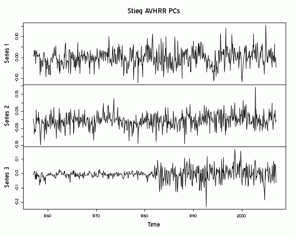 Notice that the largest ratio is .894. The sequences are all considerably less variable in the time period when there were no satellite observations, a serious underestimation of the variability of the reconstruction.