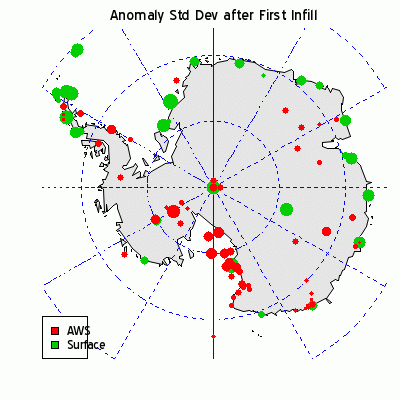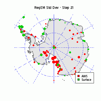 Do you see what happens? If a series has a LOT of missing data, the missing data is all set at 0 for the purposes of the standard deviation. Could a potential bias arise? Here’s a plot of the standard deviation after first step infilling. It’s interesting that the infilled standard deviations of inland stations are so much lower than coastal stations, though there’s no reason to believe that this is the case physically. It’s only because the inland stations are missing more data – which is thus set to zero and reduces the standard deviation. This might reduce the weighting of the inland stations relative to the Peninsula stations if it persists through later steps. I don’t see any code right now that would appear to compensate for this (but I haven’t finished yet.) There’s no reason why there would be such code. Schneider assumes that data is missing at random, while Steig and Mann ignore this caveat. I’ll keep you posted as I continue to work through my emulation of Schneider’s RegEM.