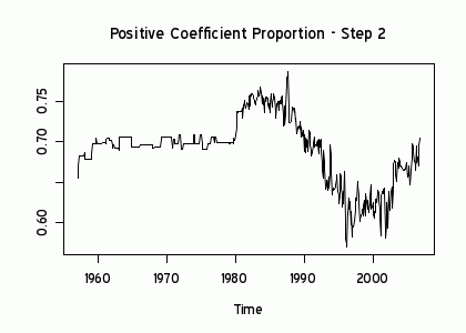 Today, I want to show a couple of graphics from the first two steps, in which I calculated the proportion of positive coefficients to total coefficients by year. Given that we’re dealing with millions of coefficients, these coefficients have to be considered statistically – something that you see in random matrix theory, which we’ve alluded to from time to time. Here they are. The proportions are not identical (I checked), but there isn’t much change in the first step.