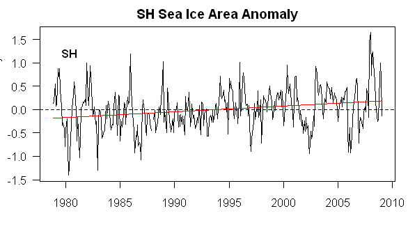 Also where do you get the idea that the antarctic sea ice has increased over the last 30 years? SH sea ice area max in 1979 ~15Mm^2, in 2008 ~15Mm^2, in 1980 min was ~1.7Mm^2, in 2009 min was ~1.7Mm^2.