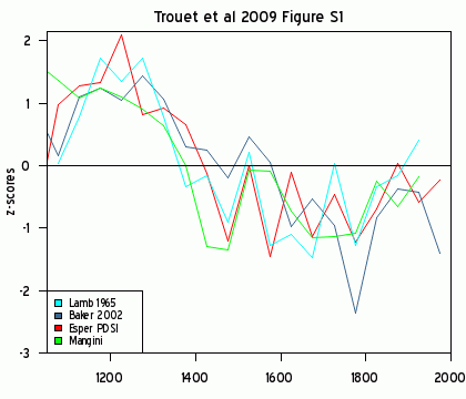 Next, here is my emulation of their Figure S1 using the speleothem version said by Andy Baker to be correct; the newly archived Esper PDSI information; my manual transcription of data from Lamb 1965; and archived Mangini information. In each case, I’ve used 50-year averages and then scaled the resulting series over 1075-1925 as in the Trouet caption, orienting the series to match the Trouet figure. As noted previously, 50-year averages match. Three of four emulations match very closely: the oddball is the Scotland speleothem, where, as noted before, Trouet has almost certainly used the detrended version, said by Andy Baker to be an incorrect version. (Andy Baker said that Trouet used the non-detrended version but I don’t think that his understanding is correct; I’ve emailed him about this.)