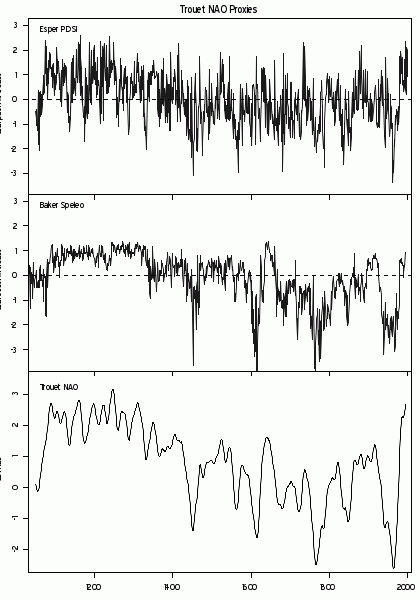 2. The eye can certainly be teased into comparing the two series. And in fairness to this perception, both series had been postulated to be connected to the NAO in independent articles (Proctor et al 2000, 2002) and Esper et al 2007, before the present joint venture article. IF both series are NAO proxies, then the big downspikes should align. Given the precision of tree ring dating, I think that there would be an excellent case for using the tree ring data to align the speleo data with its much looser dating control. I’m not exactly sure how one would express this methodology in objective statistical terms, but intuitively it makes sense to me. Perhaps Roman or UC or Hu have ideas on this.