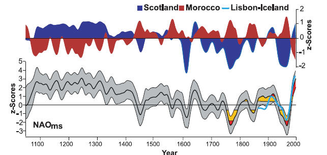 Original Caption to Trouet Fig. 1. Proxy-derived long-term NAO reconstruction. (Top) Reconstructed winter precipitation for Scotland and February-to-June Palmer Drought Severity Index (29) for Morocco. Records were normalized over the common period (1049–1995) and smoothed with the use of a 30-year cubic spline. (Bottom) Winter NAO reconstruction NAOms (black curve) is the difference of the Scotland and Morocco records. The gray area is the estimated uncertainty; yellow and red areas are the 10 and 33% highest and lowest values since 1700. The blue line represents the 30-year smoothed Lisbon-Iceland instrumental NAO index series (11).