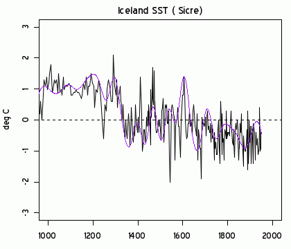 I’ve plotted the Sicre Iceland data which has a very pronounced MWP – not surprising since Iceland is the heart of the conceded MWP, but still a very pronounced result in a high-resolution series.