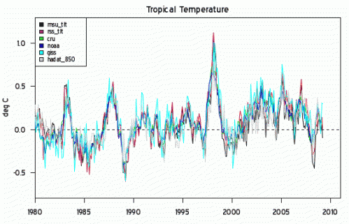 Lucia, Anthony, Roy Spencer and David Stockwell (my, there’s a growing list of analytical blogs) have already posted on March 2009 temperatures and trends. While I’m not first off the mark on this, I’ll be the first to post tropical trends – something that I do from time to time. (This requires a little bit of heavy lifting since I need to download the entire gridded data sets from NOAA, CRU and GISS to determine their tropical averages.) Maybe I’ll keep this script private from the others for a while 🙂