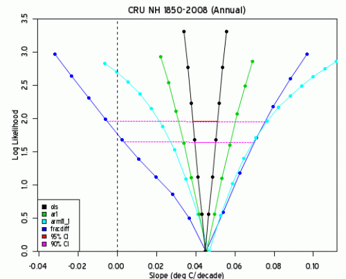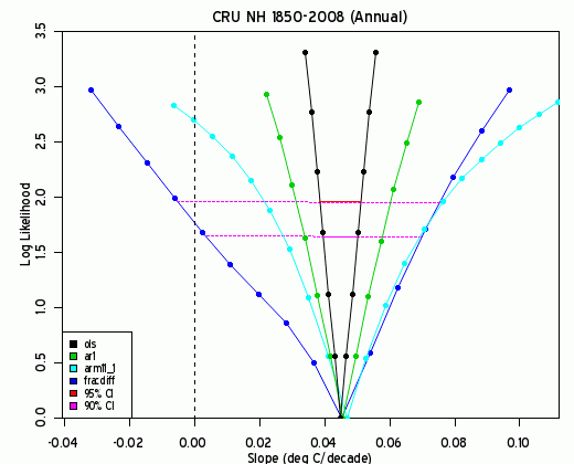 I’ve added a similar plot for annual CRU NH 1850-2008. It shows more texture in the differences between the various autocorrelation models. Zero trend (under fracdiff autocorrelation) is not precluded at a 95% level. However, these graphs show more clearly than the bare statistic that this is a two-edged sword: double the observed trend is likewise not precluded at a 85% level.