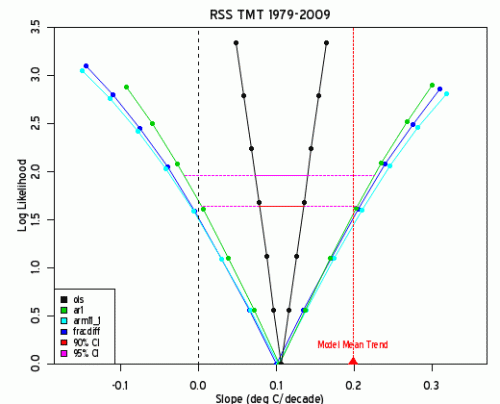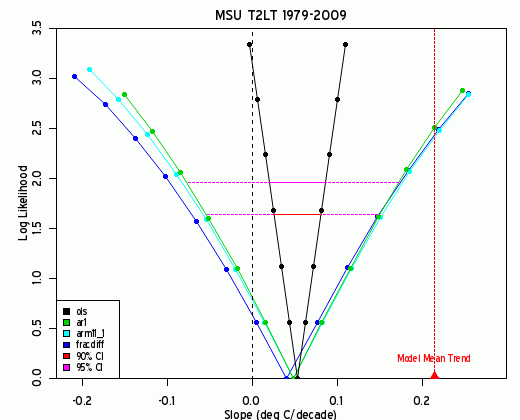 The maximum likelihood (minimum log likelihood) is similar for each of the 4 autocorrelation models (though OLS is slightly higher than the others), but the confidence intervals are much wider for AR1 and other schemes. In this example, there isn’t much difference between AR1 and more complicated autocorrelation structures (but there are other cases in which the differences are very noticeable.) I’ve also plotted the Santer T2LT ensemble mean trend, which is well outside the 95% confidence interval (using maximum likelihood) – something that we had previously reported applying the (1-r)/(1+r) degrees of freedom adjustment used in Santer et al. (but they only reported results for obsolete data ending in 1999).