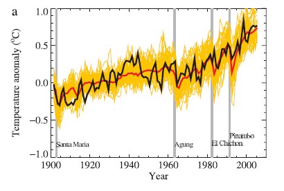 Original Caption: Figure 9.5a. Comparison between global mean surface temperature anomalies (°C) from observations (black) and AOGCM simulations forced with (a) both anthropogenic and natural forcings …. All data are shown as global mean temperature anomalies relative to the period 1901 to 1950, as observed (black, Hadley Centre/Climatic Research Unit gridded surface temperature data set (HadCRUT3); Brohan et al., 2006) and, in (a) as obtained from 58 simulations produced by 14 models with both anthropogenic and natural forcings. The multimodel ensemble mean is shown as a thick red curve and individual simulations are shown as thin yellow curves. Vertical grey lines indicate the timing of major volcanic events. Those simulations that ended before 2005 were extended to 2005 by using the first few years of the IPCC Special Report on Emission Scenarios (SRES) A1B scenario simulations that continued from the respective 20th-century simulations, where available. … The multi-model ensemble mean is shown as a thick blue curve and individual simulations are shown as thin blue curves. Simulations are selected that do not exhibit excessive drift in their control simulations (no more than 0.2°C per century). Each simulation was sampled so that coverage corresponds to that of the observations. Further details of the models included and the methodology for producing this figure are given in the Supplementary Material, Appendix 9.C. After Stott et al. (2006b).
