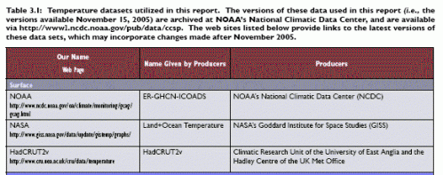 As CA readers know, there are three major temperature indices that one encounters in public debate: HadCRU, GISS and NOAA. These were used for comparing troposphere and surface trends in the CCSP report that is a reference point for both Douglass and Santer, as shown in their Table 1 below.