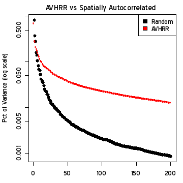 Comparison of Eigenvalues for AVHRR and Random data. Proportion of variance of first 200 eigenvalues shown on log scale .