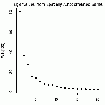 As I observed earlier this year here, if you calculate eigenvalues from spatially autocorrelated random data on a geometric shape, you get eigenvectors occurring in multiplets (corresponding to related Chladni patterns/eigenfunctions). The figure below shows the eigenvalues for spatially autocorrelated data on a circular disk. Notice that, after the PC1, lower eigenvalues occur in pair or multiplets. In particular, notice that the PC2 and PC3 have equal eigenvalues.