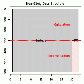 For now, I thought that it would be useful to consider a situation where we have both PCs and Truncated Total Least Squares without RegEM and see what it does. As an experiment along these lines, I created a block-matrix structure that was “complete” except for the reconstruction – illustrated below. Let’s assume that we have a complete subset of station data over both the calibration and reconstruction period. In my example analyzed here, I’ve made a “complete” subset by only using stations with at least 240 values (out of 600) and infilling the missing values using Steig RegEM (regpar=3) purely for the sake of argument. In the example here, I’ve used 3 PCs, again purely for the sake of argument.