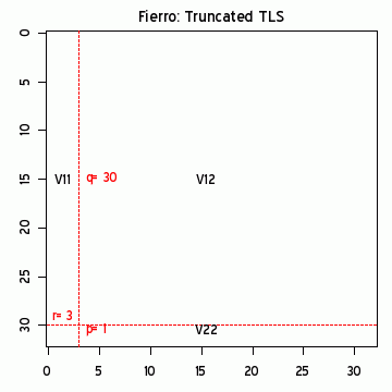 Truncated Total Least Squares is pretty much the same thing – only the truncation occurs in a Total Least Squares algorithm with an augmented matrix. Fierro 1997 describes the TTLS algorithm through language that is summarized in the diagram below, shopwing the decomposition of the eigenvector matrix from SVD on the strong> augmented matrix described above. In the case illustrated here, the decomposition of the eigenvector matrix (regpar=r=3 in this case) into submatrices for the truncated TLS coefficients which are obtained through the following equation :