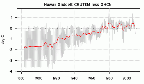 First, here’s a graphic showing an interesting contrast between the CRUTEM gridded data and the NOAA/GHCN gridded data for the Hawaii gridcell (157.5W, 22.5N). In one of his FOI obstructions, Phil Jones argued that CRUTEM data was already available at GHCN. But as you see, the CRUTEM gridded version for the Hawaii gridcell is remarkably different from the NOAA GHCN version.