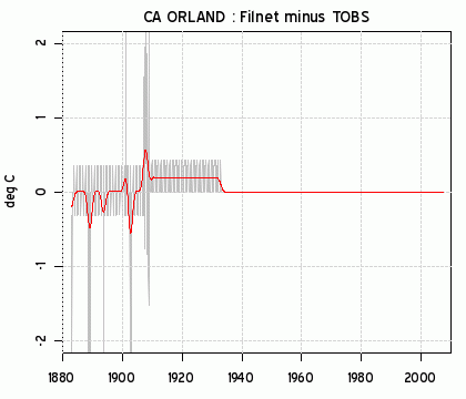 As a benchmark, here is the difference between FILNET (adjusted) and TOBS for Orland in the “old” USHCN. Adjustments in the 20th century are negligible – in keeping with station history information that indicates no changes in location.